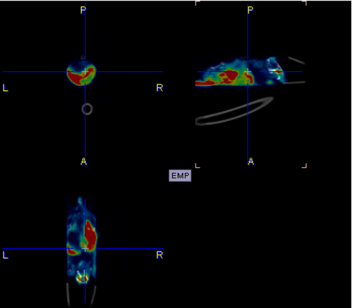 實驗動物(wù)為(wèi)小(xiǎo)鼠,體(tǐ)重約20g,由杭州醫(yī)學院實驗動物(wù)中心提供,掃描地(dì)點為(wèi)浙江大(dà)學附屬第二醫(yī)院pet 中心。注射藥物(wù)45min後采集圖像,獲得(de)藥物(wù)在體(tǐ)內(nèi)分(fēn)布圖。腦(nǎo)內(nèi)信号較弱,能(néng)夠突破血腦(nǎo)屏障,因為 (wèi)健康小(xiǎo)鼠,腦(nǎo)內(nèi)幾乎沒有(yǒu)tau蛋白(bái)沉積,難以停留。